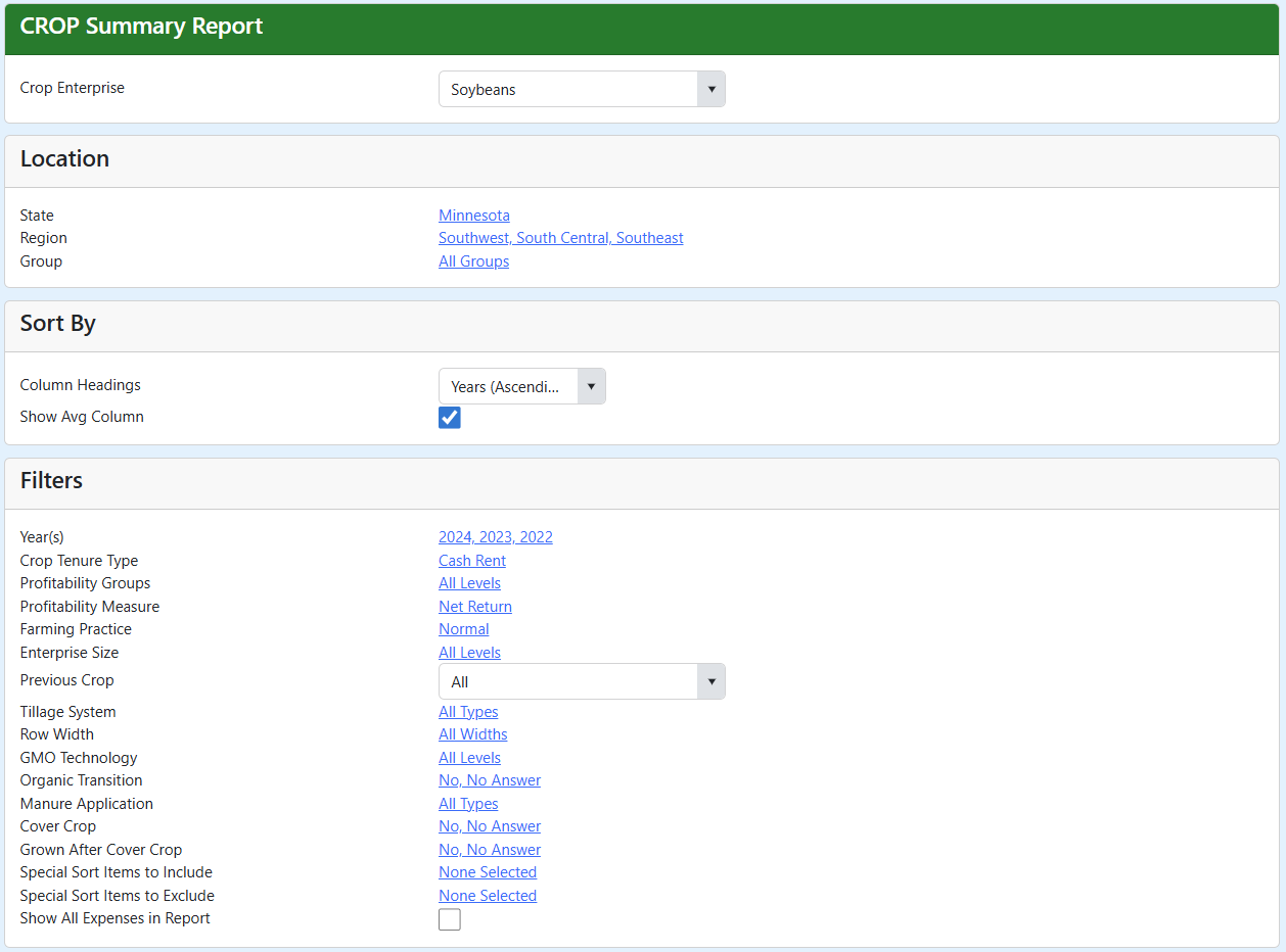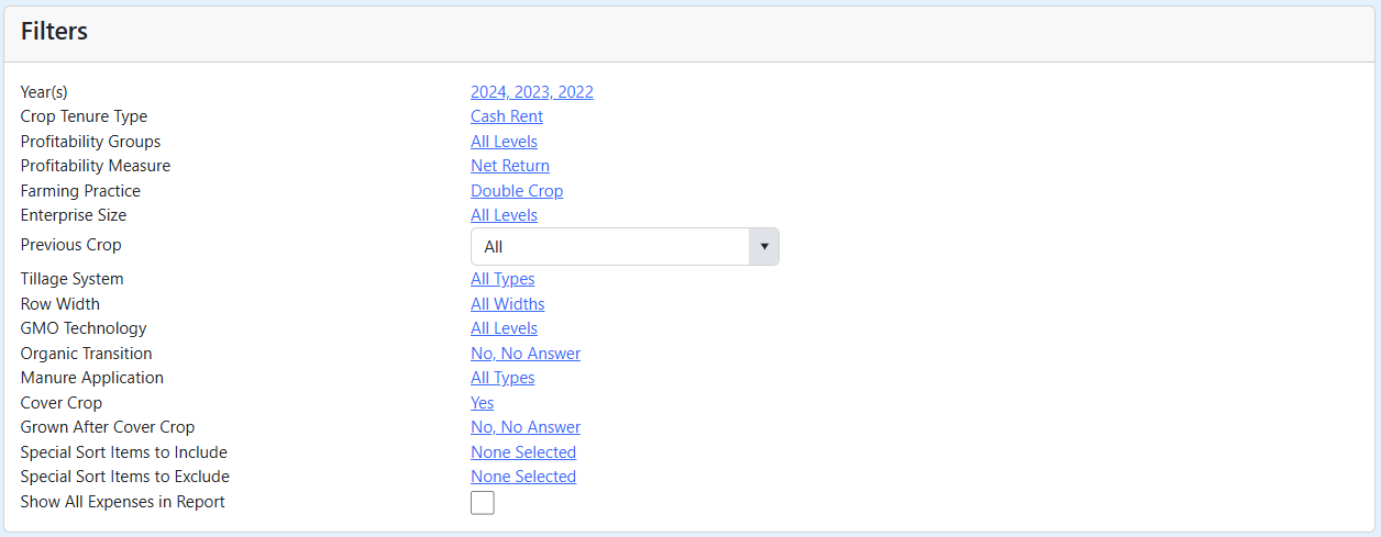 Since the potential impacts of a cover crop are incurred during and/or after the growth of the cover crop, FINBIN methodology ties the cover crop to the cash crop planted after the cover crop. To query for the cash crop grown after a cover crop, specify the cash crop is ‘Grown After a Cover Crop’ in the search filter criteria. This report will show any impacts the cover crop has made on the cash crop, but will not show expense or production information of the specific cover crop. (To see the expenses and production of the cover crop, query for the cover crop enterprise in FINBIN rather than the cash crop.)